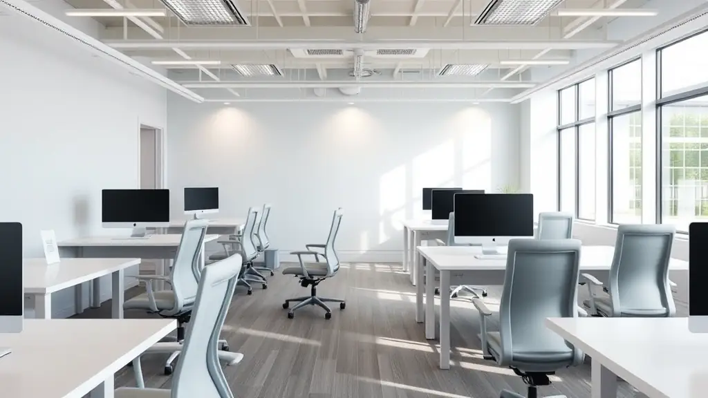 An innovative, functional office environment designed to foster productivity and creativity, featuring modern furniture and collaborative zones.